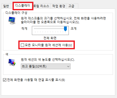 다만 회사에서 다중 모니터를 사용하였다면, 원격으로 접속시 다중모니터를 사용하기 위해 설정이 필요하다.