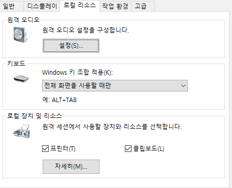 원격데스크탑 연결시에 로컬 리소스의 원격 오디오 설정을 변경하면 된다. 원격 오디오 재생과 원격 오디오 녹음을 이컴퓨터에서 재생, 이 컴퓨터에서 녹음을 각각 선택하면 된다.
